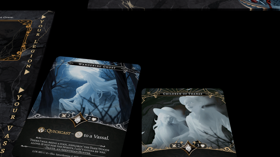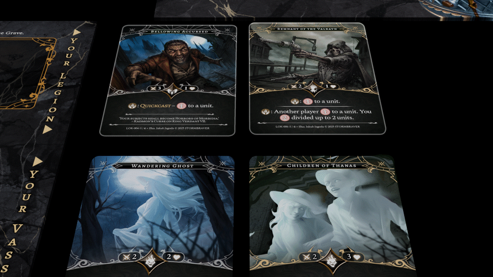 Every turn, a unit will ambush each player. These units are a part of Kadmon's Legion. As a Death Summoner, you can summon your own unit or cast a spell. Every card in the game can act as both a unit or a spell in an intricate duality. You must choose carefully on how to use each card.